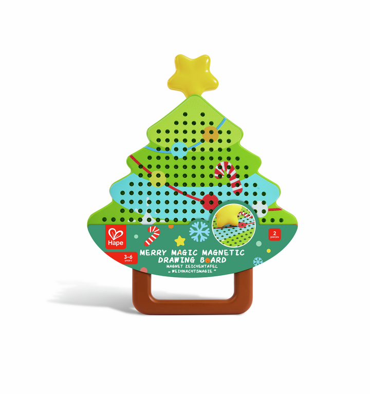 Tablero con forma de Árbol de Navidad compuesto por pequeñas bolitas imantadas que suben a la superficie gracias al poder del lápiz magnético que permite formar figuras y diseños en 2D.