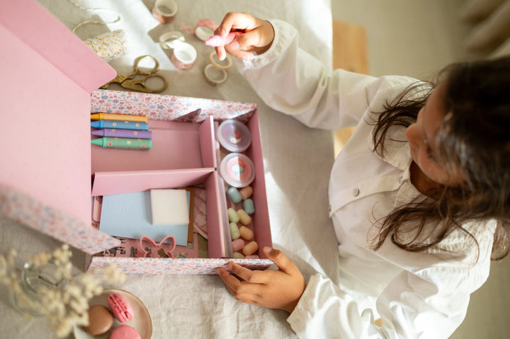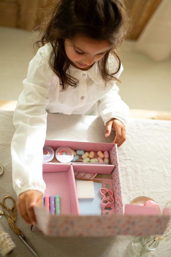 Caja de creativas inspirada en la muñeca Rosa , todo lo necesario para empezar a crear de forma inmediata. Ej: pegatinas, papel para dibujar, crayones de cera, foam para modelar, sellos...