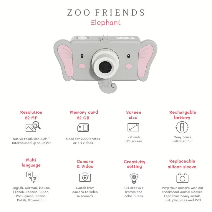 La Zoo Friends es una cámara digital con forma de animalitos ideal para los niños. Su cálida carcasa de silicona les anima a hacer fotos. La cámara está diseñada ergonómicamente para que las manos de los más pequeños puedan sujetarla y manejarla con facilidad.