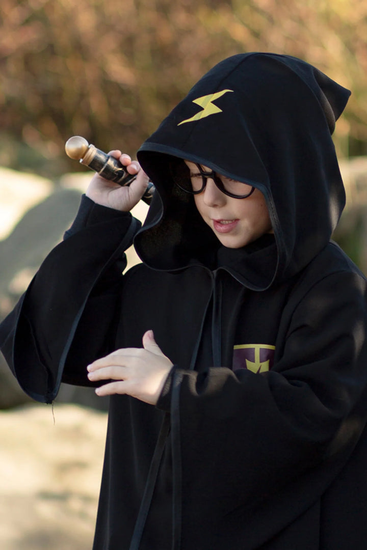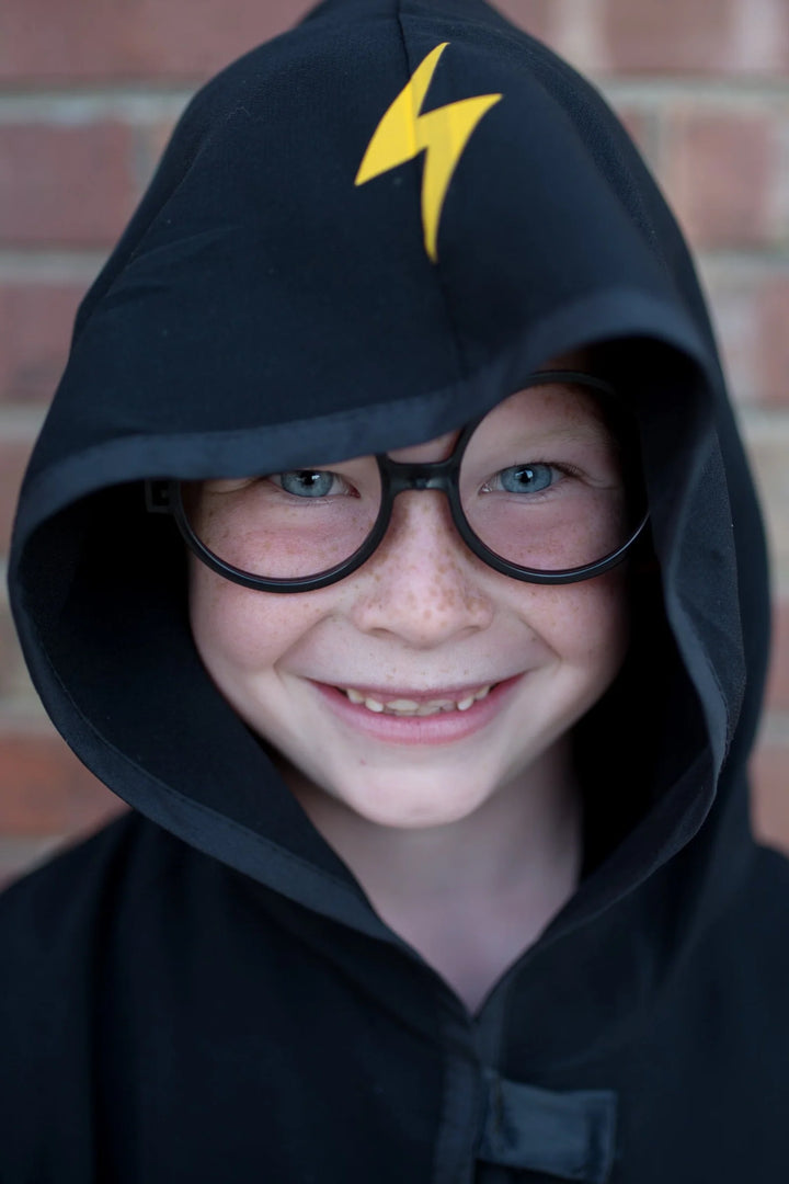 Felicidades! ¡Has sido aceptado en la escuela de magos! Un diseño de alta calidad hecho con tela negra muy suave. Esta capa negra con capucha está adornada con un rayo en la capucha, ¡y viene con un juego de gafas!