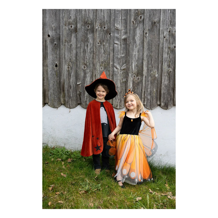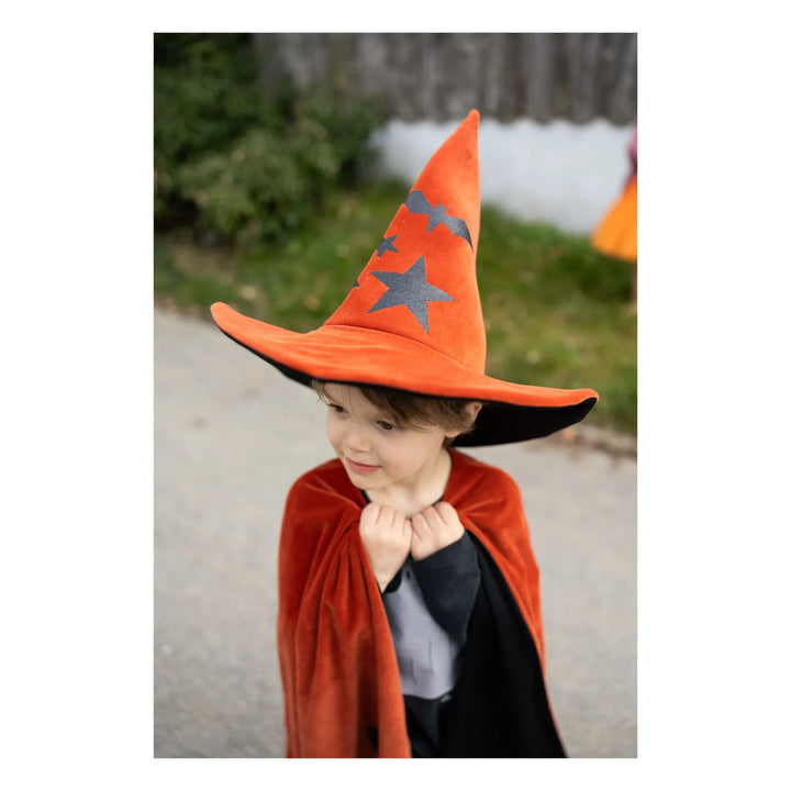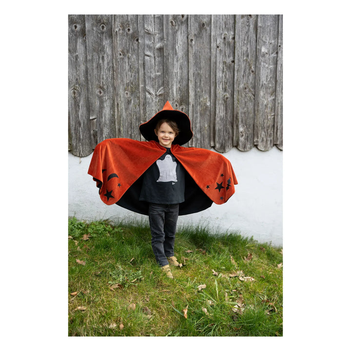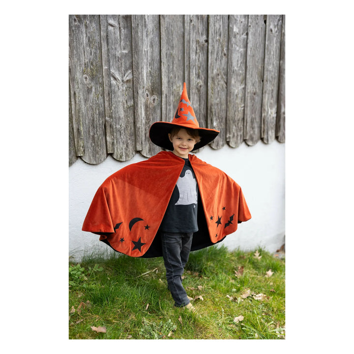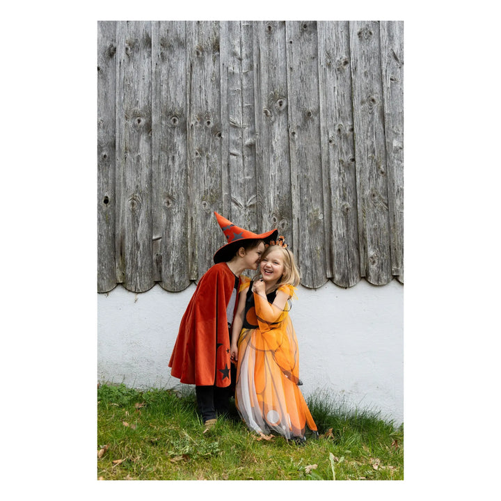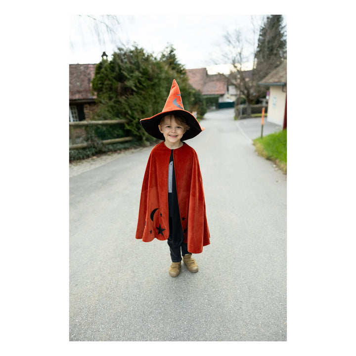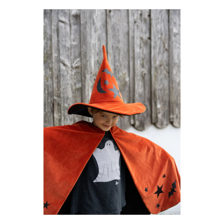 Conjunto de capa y sombrero de mago en tonos otoñales, perfecto para niños que quieren vivir aventuras mágicas con estilo y calidez.