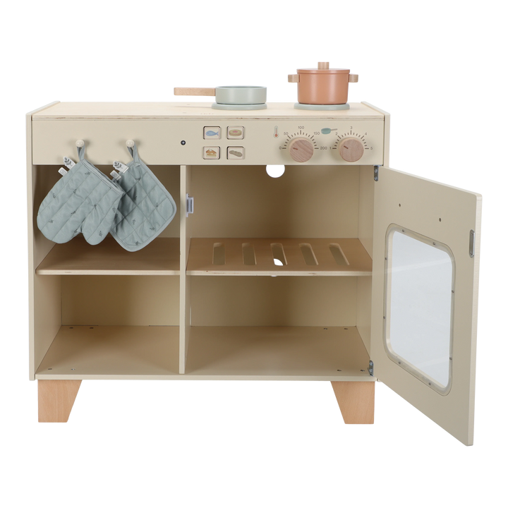 ¡Atención, pequeños chefs! Esta preciosa estación de cocina de madera es perfecta para preparar las comidas más deliciosas. Hornee un pastel o cocine verduras frescas en el horno. El set incluye dos sartenes, una manopla y un paño, y está equipado con botones con ilustraciones para mayor realismo. Combine la cocina con el refrigerador o el set de lavadora y lavavajillas para crear una cocina de juguete completa. ¿Qué hay en el menú de hoy?