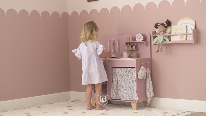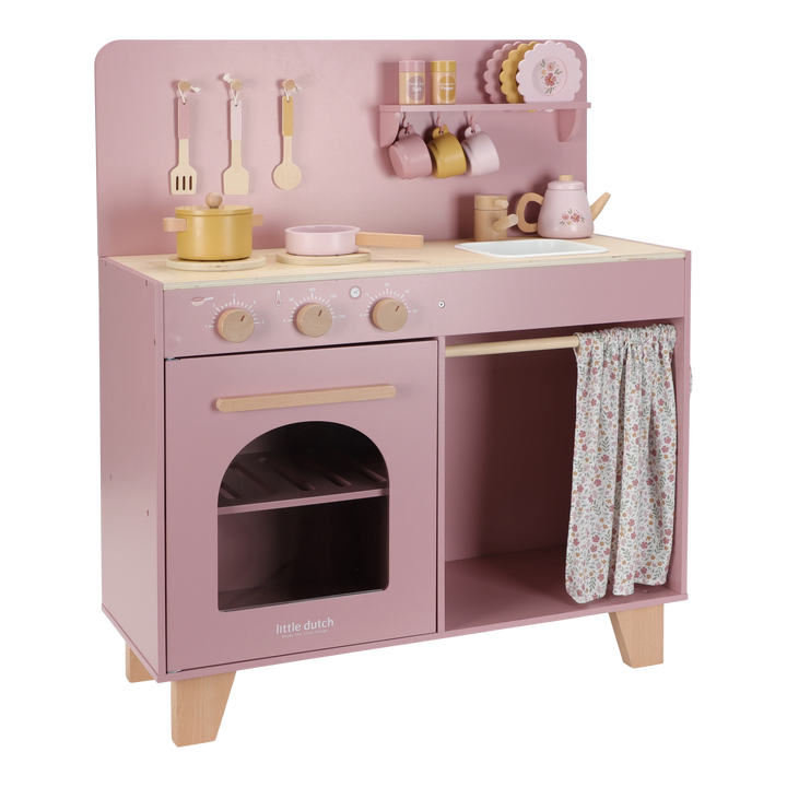 ¡Pequeños chefs, preparados para guisar unas deliciosas comiditas! Con esta cocina de juguete rosa de madera, podrán sumergirse en el mundo de la cocina y la repostería. El set incluye dos sartenes, utensilios de cocina, tres tazas y tres platos, todos con alegres ilustraciones. Horneen un pastel en el horno o cocinen verduras en los fuegos, que produce un sonido burbujeante al colocar una sartén sobre ella. Lávense las manos en el fregadero y guarden la compra en la alacena. El microondas tiene botones reales con ilustraciones, y con el juego de sal y pimienta, podrán darle un toque especial a cada plato. La cortina de tela, el paño de cocina y la manopla de horno están decorados con el suave estampado de flores suaves. ¡Una encantadora cocina de juguete para una diversión sin fin cocinando!