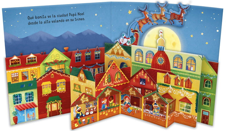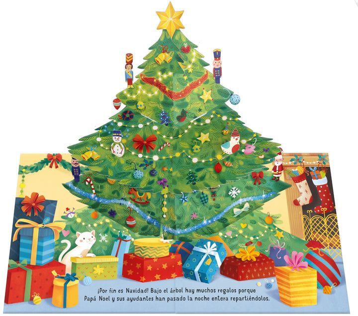Un precioso libro para niños pequeños con escenas desplegables…que se abren al pasar las páginas. Cada página presenta una…colorida escena típica de la Navidad, con muñecos de nieve, elfos…envolviendo regalos, o Papá Noel y sus renos volando por el cielo…estrellado.……Los espectaculares desplegables de papel y las bonitas…ilustraciones hacen de este libro un regalo de Navidad muy…especial.…Diseñado para resistir sin problemas un uso continuado.