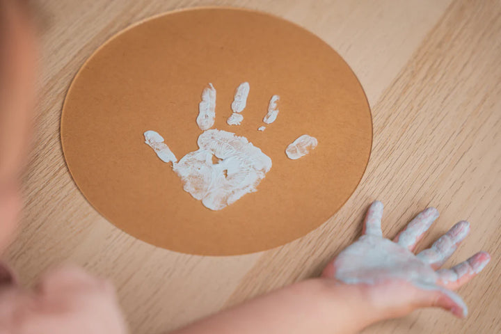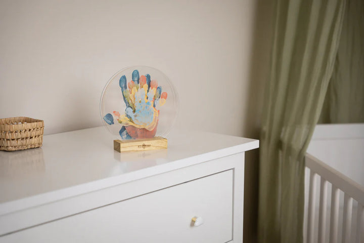 El Marco Dúo - Daisy Ochre combina armoniosamente una huella de bebé y una foto. Este marco de mesa añade un toque encantador a tu decoración con su fondo reversible beige con o sin un dibujo de corazones. El kit incluye arcilla hipoalergénica, un rodillo e instrucciones para crear fácilmente la huella.