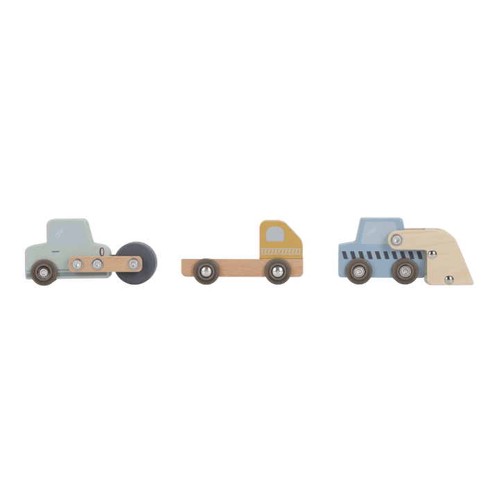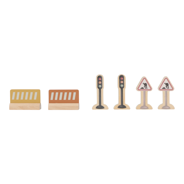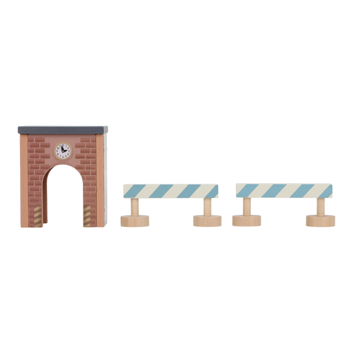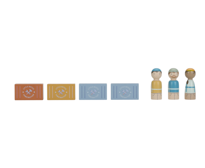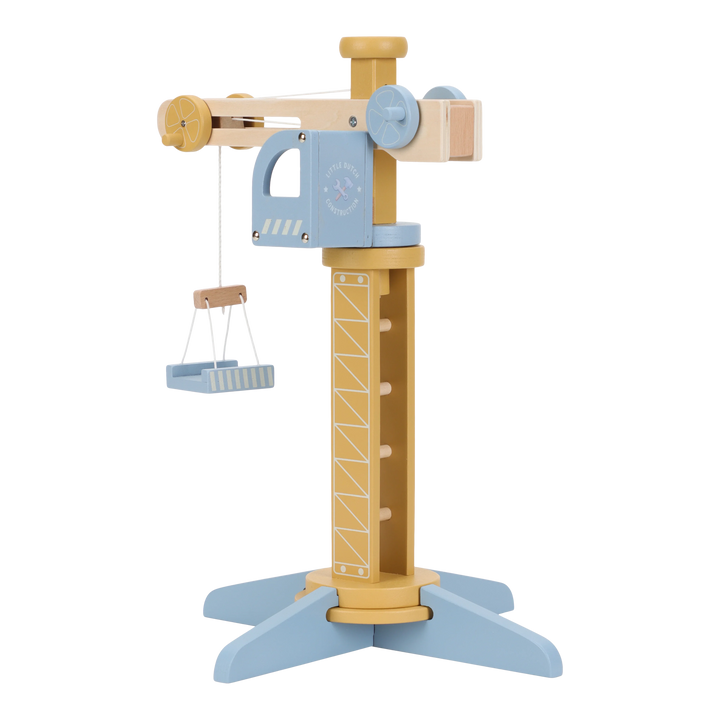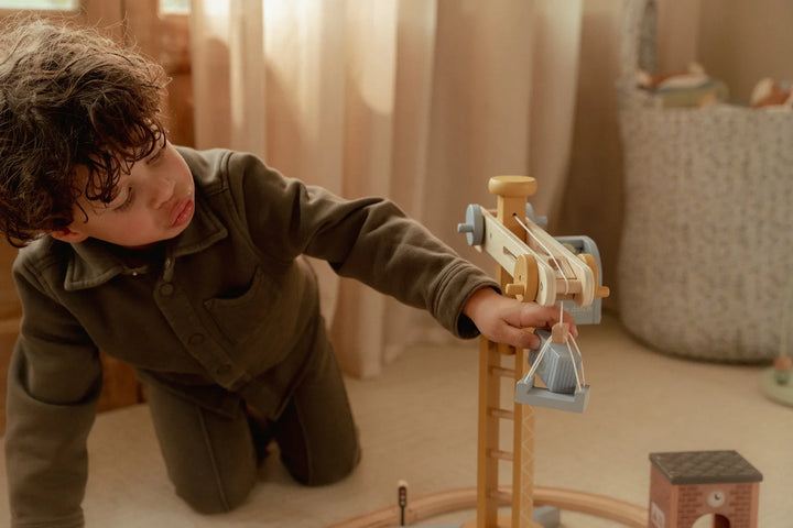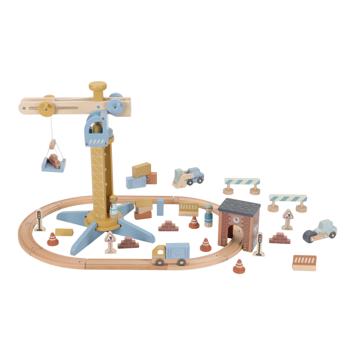 ¡Construye y mueve! Esta grúa de madera levanta cargas y las baja de forma segura. Incluye materiales de construcción, vehículos, obreros y señales de tráfico. ¡Perfecta para pequeños constructores y fácil de combinar con la vía de tren XL!