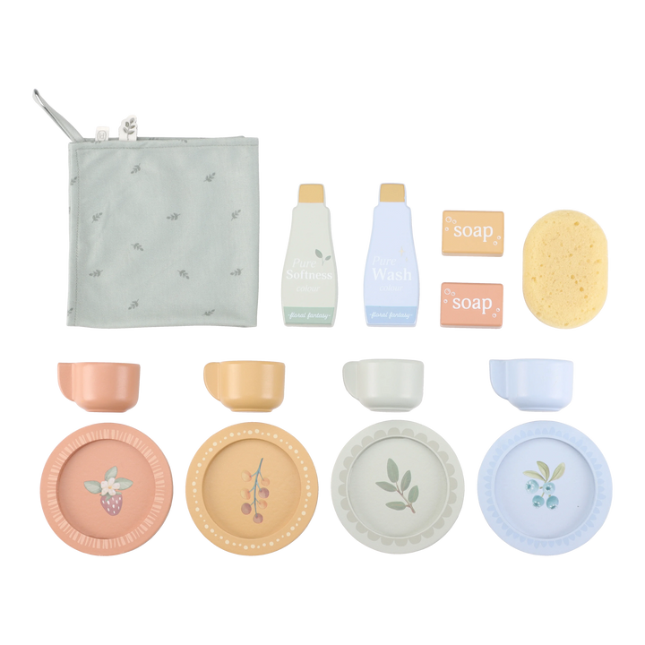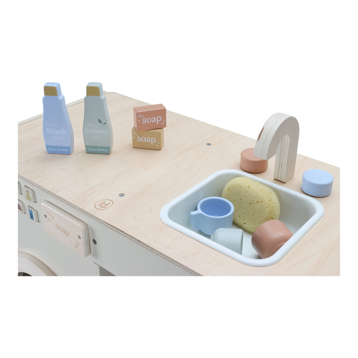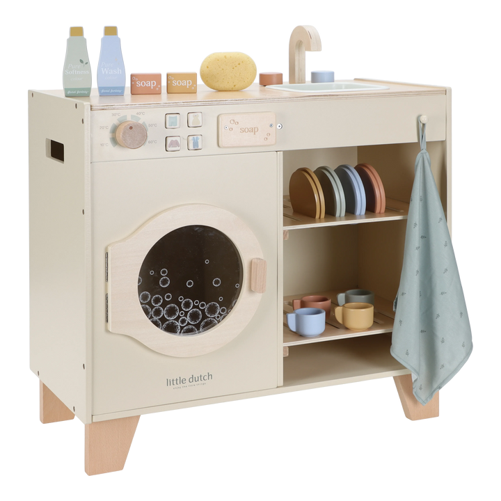 Con esta lavadora y lavavajillas de madera, las tareas del hogar se convierten en una auténtica aventura. El set incluye cuatro tazas, cuatro platitos, dos platos, detergente, pastillas de jabón y un paño de cocina. Lava los platos en el fregadero y lava la ropa de la muñeca en la lavadora. Los botones realistas con ilustraciones y el compartimento especial para la pastilla de jabón hacen que jugar sea aún más divertido. Combina la lavadora y el lavavajillas con la cocina de juguete y el frigorífico para crear un rincón de cocina completo. Diversión sin límites para los pequeños héroes del hogar.