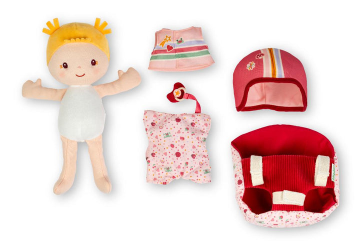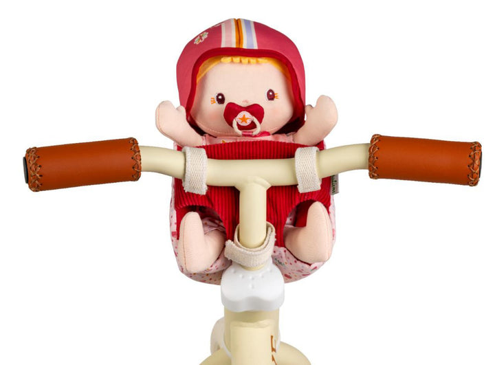 ¿Estás listo para un paseo en bicicleta con la muñeca Lena? Con este muñeco de tela y su asiento de bicicleta, tu hijo tendrá todo lo necesario para imitar a los mayores y salir a pasear con su bicicleta o bici de equilibrio, a partir de los 18 meses. ¡Con sus 3 accesorios extraíbles, la muñeca Léna está lista para la aventura! Su chupete está unido a su mono estampado para que nunca lo pierda. Es magnético para sujetarlo a la cara de la muñeca y que no se caiga al salir. Para mayor seguridad, incluso tiene su propio chaleco y casco: ideal para enseñar a tu pequeño qué equipamiento esencial necesita para sus propias salidas sobre dos ruedas. El asiento de la bicicleta de la muñeca se fija muy fácilmente al manillar, gracias a sus tres cierres de velcro. ¡Todo lo que tienes que hacer es instalar a la bebé Lena en su asiento, mirando hacia tu hijo, y a disfrutar de un respiro de aire fresco! Suficiente para animar a tu pequeño a pasar tiempo al aire libre en buena compañía y satisfacer a todos los nuevos padres que aman cuidar niños. Describen el paisaje, se aseguran de que su muñeca se lo pase bien y la cuidan cuando necesita un descanso. ¡Esta muñeca de tela Lilliputiens ayuda a estimular la imaginación de los niños y los sigue a todas partes!
