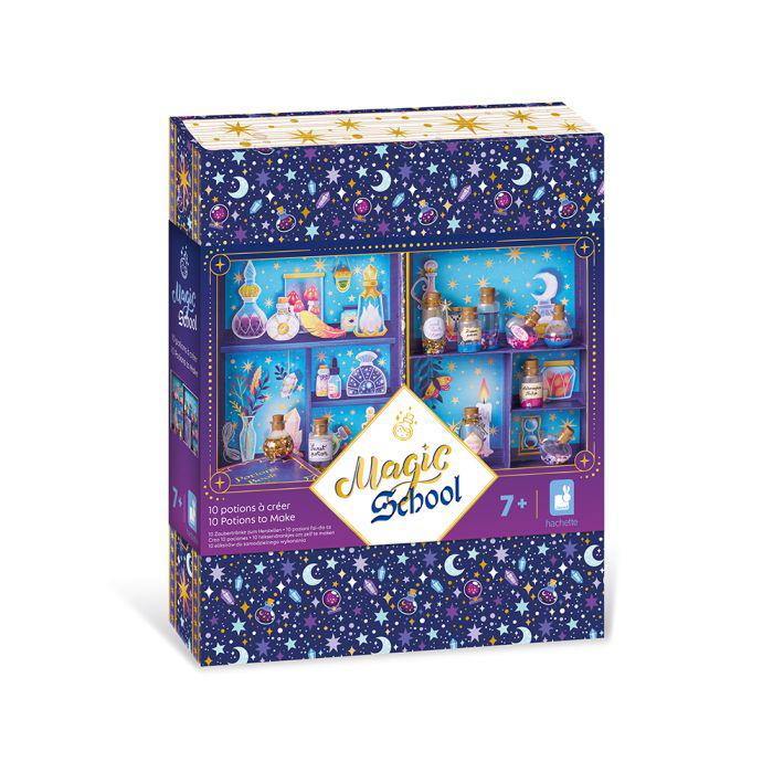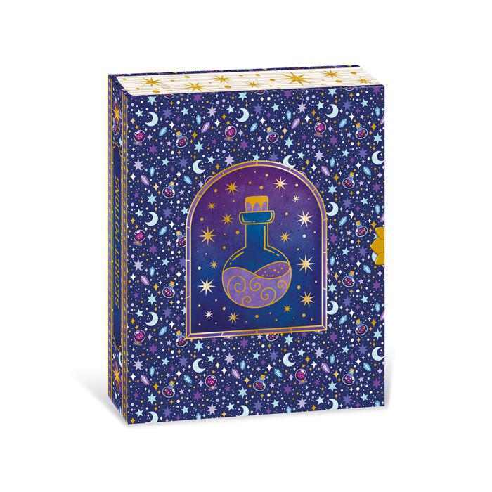 ¡Una pizca de estrellas, unas pocas lentejuelas y un toque de cuentas! ¡Esta caja creativa te permite hacer tus propias pociones mágicas en pequeños frascos usando una multitud de ingredientes y un libro de hechizos de recetas mágicas! Contiene 10 frascos de plástico con tapón, 2 tubos de arena, 20 cuentas acrílicas, 1 colgante de varita mágica, 1 varita de llave, 1 hilo dorado, 1 embudo, 2 bolsas de minibrillantes, 1 bolsa de palitos (3 modelos), 1 bolsa de estrellas, 1 bolsa de confeti metalizado, 1 lámina de pegatinas y 1 pequeño libro de hechizos con recetas. Esta actividad te permite desarrollar tu paciencia y creatividad y requiere aproximadamente 5 minutos por poción.