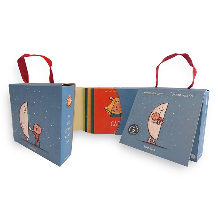 Luna, Cocodrilo y Bebé conforman el contenido de la maleta que se completa con Cara y ?Flores, las dos últimas novedades publicadas recientemente. Una selección de cinco obras imprescindibles que, como el resto de de la colección, se apoyan en los recursos del cancionero tradicional infantil (rima, ritmo, enumeración, repetición, verso y estribillo, acumulación...) y en imágenes reconocibles sobre fondos claros para contribuir a iniciar el camino de la prelectura de niños y niñas.