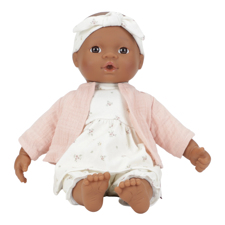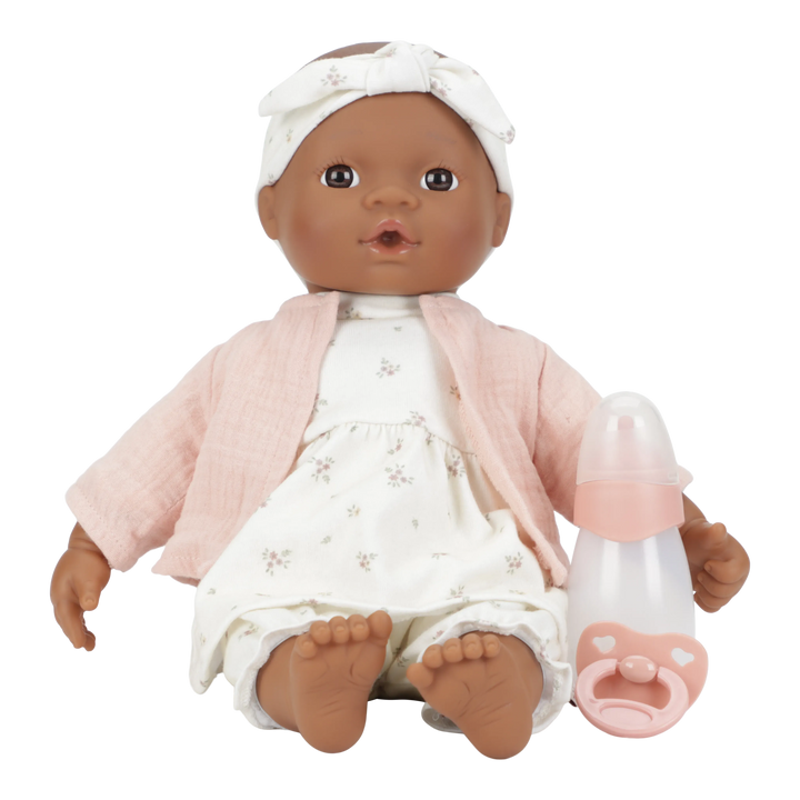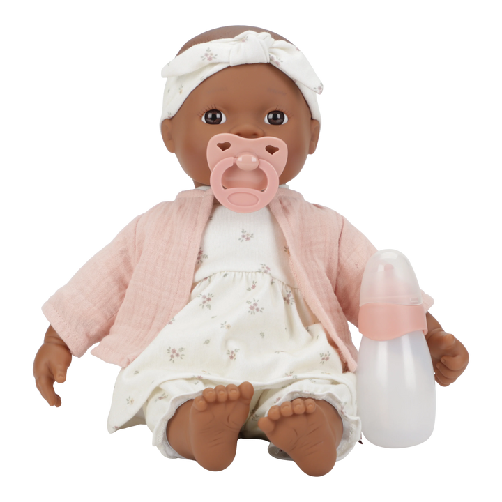Conoce a la bebé Noa. Dale un abrazo y cuídala. Noa es una muñeca adorable y realista, con un cuerpo suave y mimoso, a la que le encanta que la quieran. Puedes cambiarle de ropa, ayudarla a dormir y calmarla con el chupete. Cuando tenga hambre, ofrécele el biberón de leche. A los niños les encanta imitar todo lo que hacen sus padres, y esta muñeca inspirará a su pequeño a participar en juegos de roles de crianza y cuidado. Noa está vestida con una diadema, un vestido y pantalones del diseño White Meadows, con un chaleco rosa suave.