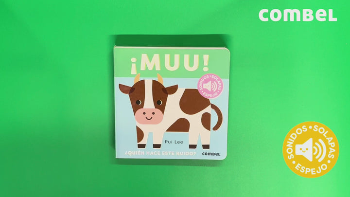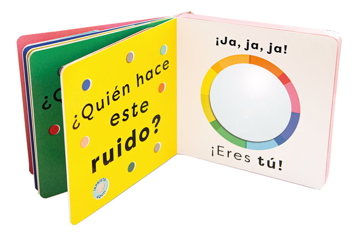 Un libro todo cartón, con solapas y sonidos en todas las páginas, y con un espejo como sorpresa final. Después de escuchar el sonido de