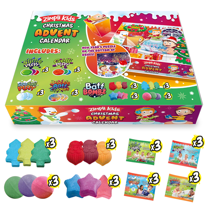 El Calendario de Adviento Zimpli Kids hace que la Navidad sea mucho más emocionante. Con 24 usos, incluyendo Bombas de Baño, Slime Play, Gelli Play, Snoball Play y Crackle Baff, ¡hay algo para todos!