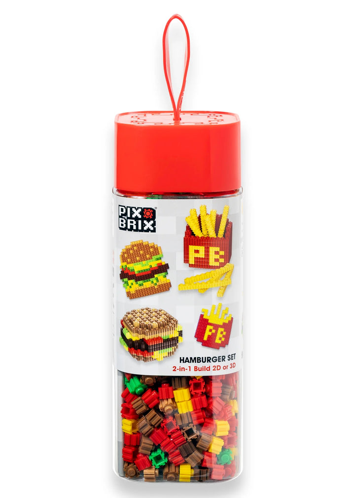 Empaquetado en una botella Pix Brix transparente y reutilizable, este set es funcional y coleccionable. La tapa de rosca de la botella incluye un colgador/llavero incorporado, para que puedas enganchar y exhibir con orgullo tus creaciones de comiditas terminadas en tu mochila, bolso o llavero.