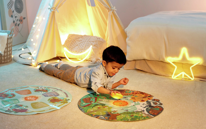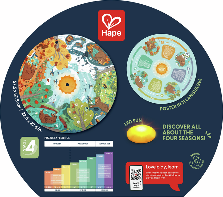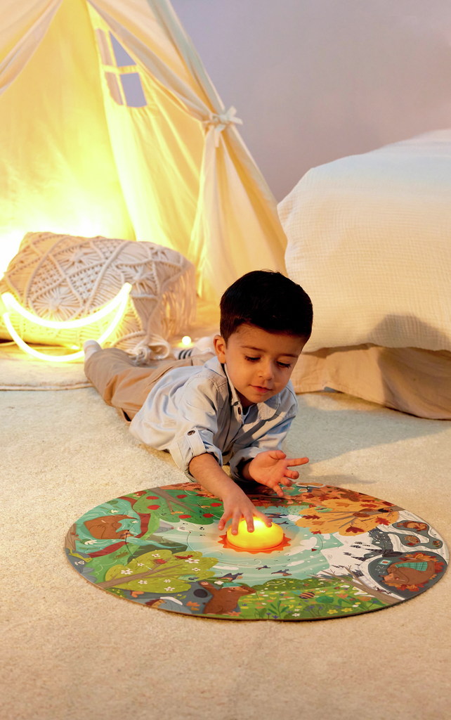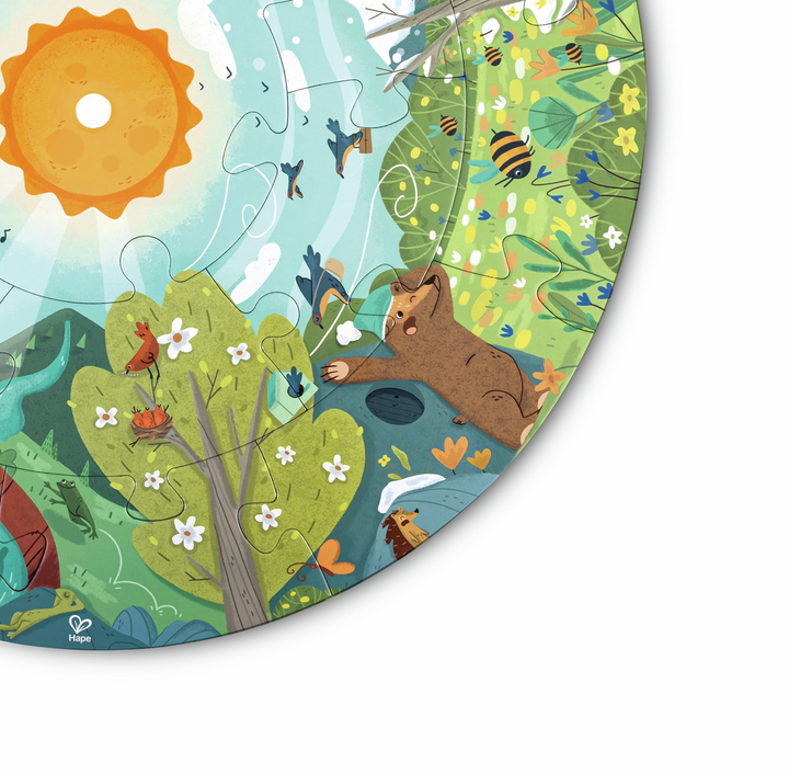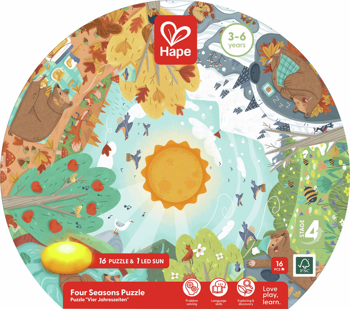 Aprende y descubre las estaciones junto al simpático oso en este increíble puzzle. Con un sol LED y un póster de doble cara, este puzzle de 16 piezas es perfecto para fomentar la imaginación y la curiosidad.