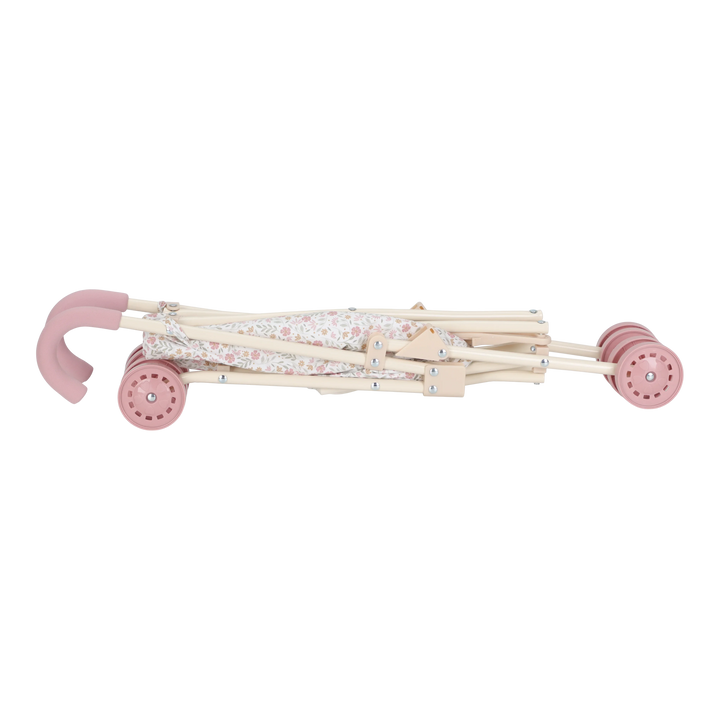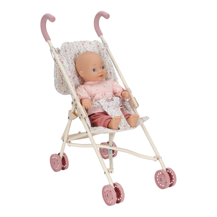Este cochecito de metal para muñecas es perfecto para las aventuras de tu bebé. Con un robusto armazón en color hueso, detalles rosas y un asiento alegre, este cochecito no solo es práctico, sino también bonito. El cinturón de seguridad garantiza que tu muñeca se mantenga bien sujeta, incluso durante los paseos más aventureros. Una práctica bolsa de almacenamiento en el asa ofrece espacio para los accesorios de la muñeca, para que tengas todo lo que necesitas para un día genial con tu muñeca.