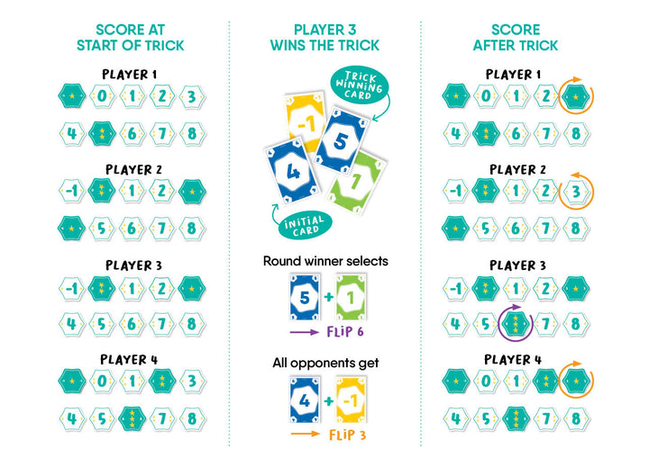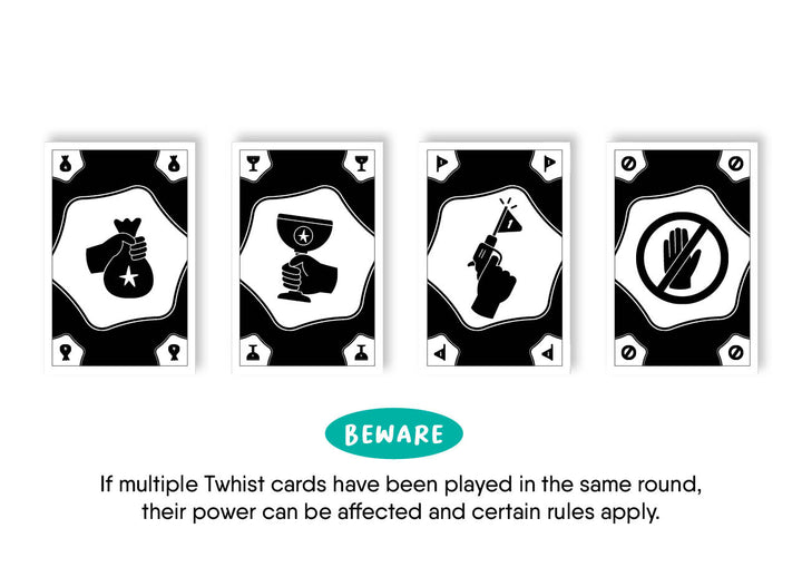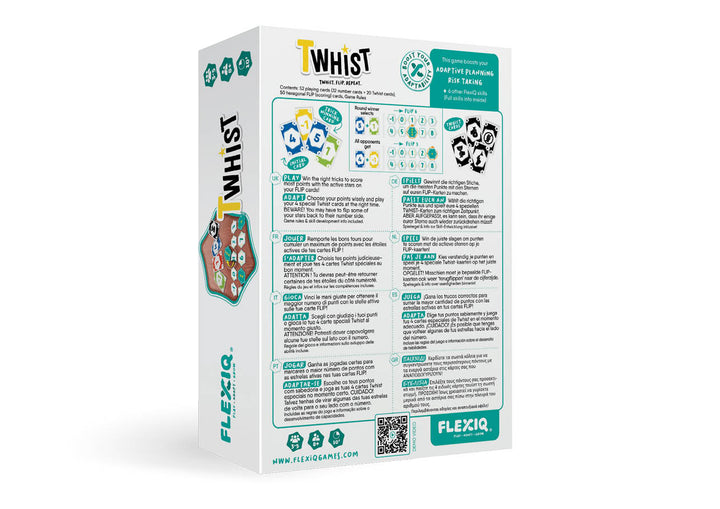 Twhist es un nuevo e innovador juego de bazas, lleno de giros inesperados, que pondrá a prueba al máximo tus habilidades tácticas y tu adaptabilidad. Usa tu mano con inteligencia para ganar bazas y conseguir estrellas activas en tus cartas. Para ganar una baza, juega la carta más alta del palo principal. El ganador de la baza elige una o dos cartas y, de esta manera, determina qué cartas deben ser volteadas, tanto él como sus oponentes. Dependiendo del número de cartas seleccionado, puede que tengas que voltear tus estrellas activas de nuevo a su lado numérico. Y quizás más tarde de nuevo al lado de las estrellas, ¡y así sucesivamente! Cada jugador también tiene 4 cartas de Twhist. ¡Úsalas en el momento justo para ser más astuto que tus oponentes! Una carta para ganar una baza, otra para robar una baza, otra para empezar la siguiente baza y otra para pasar una baza. Gana quien consiga más estrellas en sus cartas FLIP: