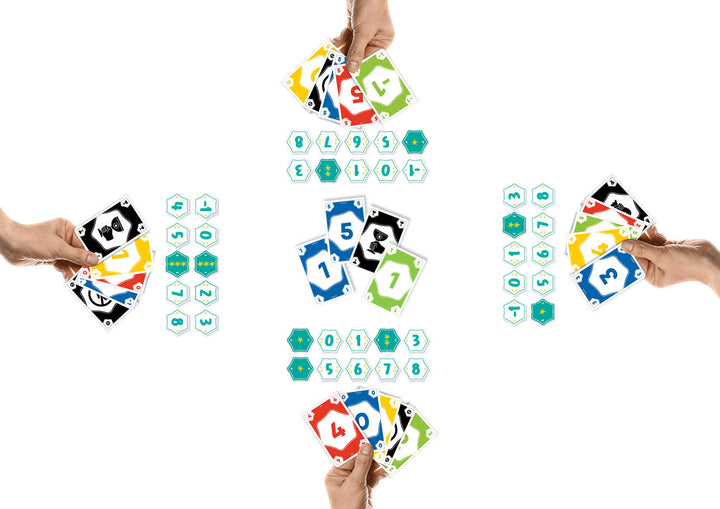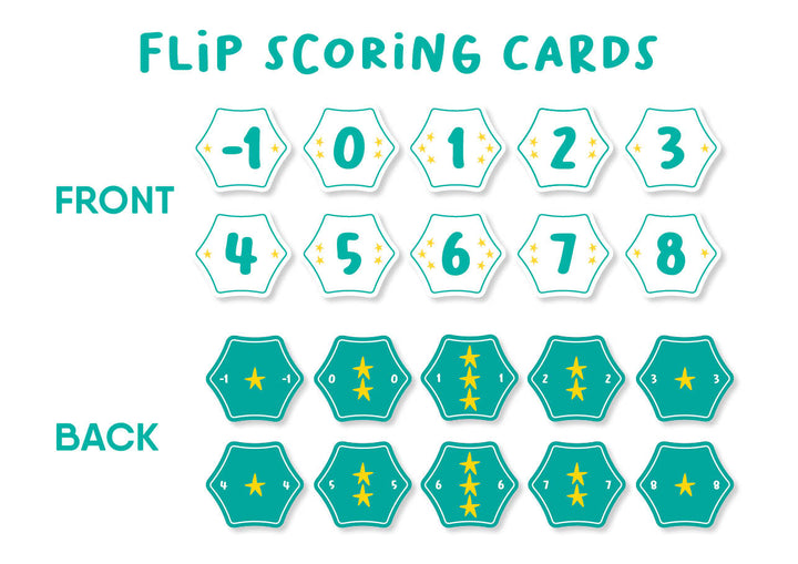 CONTENIDO: 52 cartas de juego, 50 cartas hexagonales FLIP de puntuación, 1 instrucciones del juego.