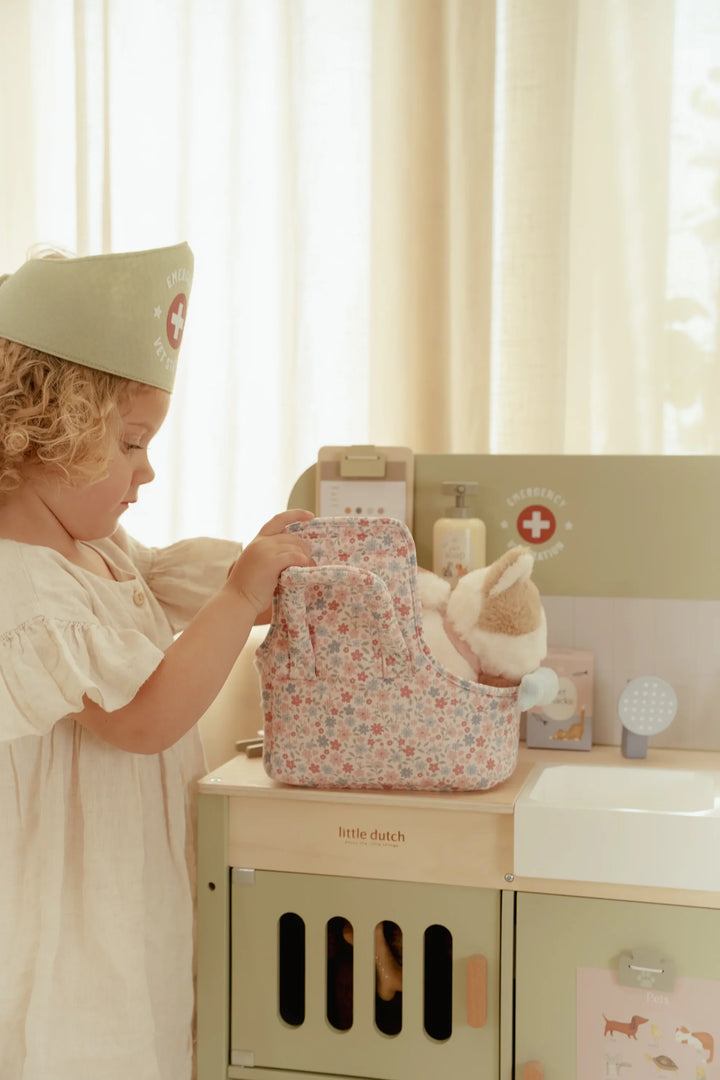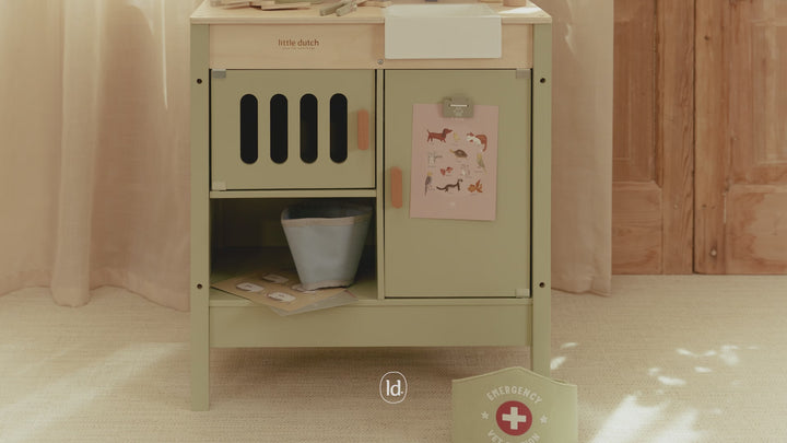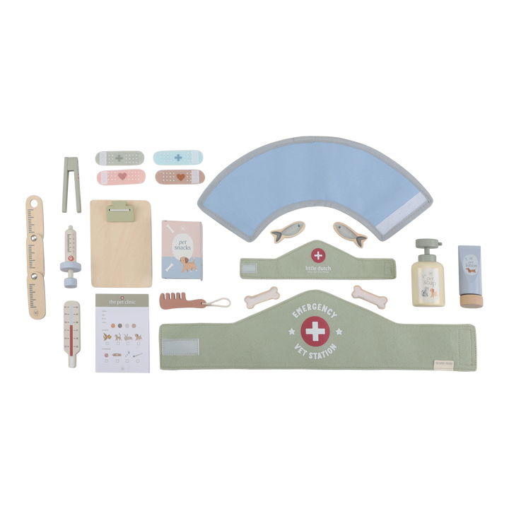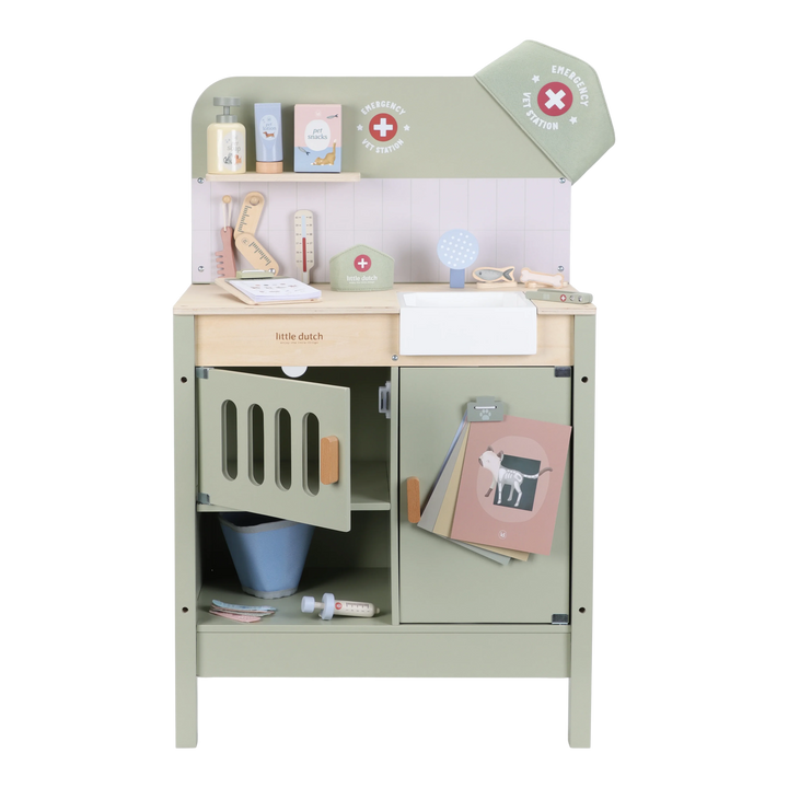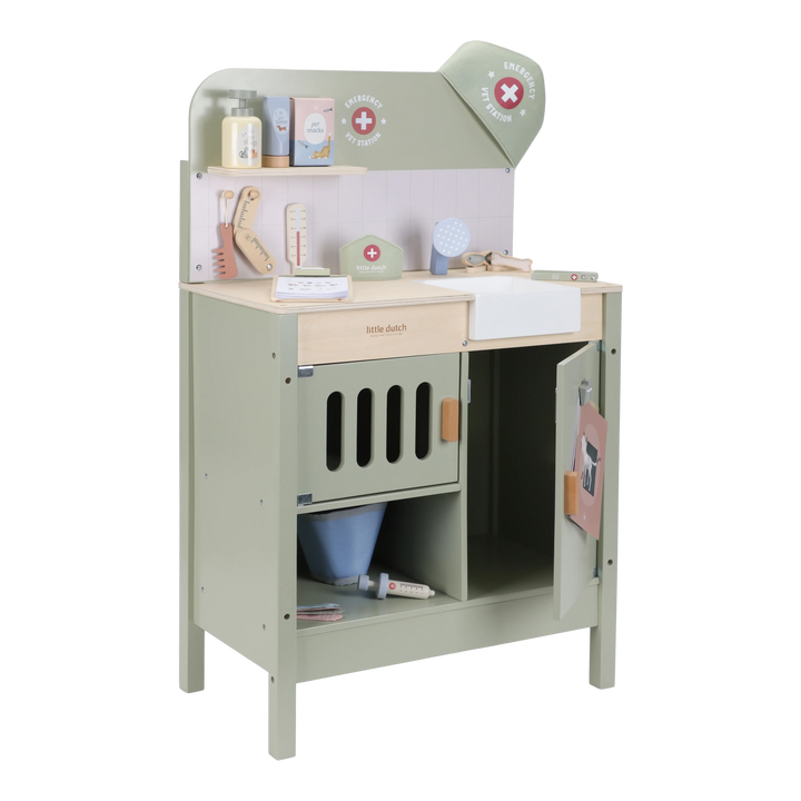 ¿Cuidas bien de peluches y mascotas de juguete enfermas? Con esta amplia clínica veterinaria de madera, tu pequeño podrá sumergirse por completo en el rol de un veterinario de verdad. El set contiene todo lo necesario para cuidar mascotas, como una ducha retráctil con lavabo, un peine, un termómetro, una jeringa y vendas. También incluye una diadema de tela y un clip especial para mostrar ilustraciones médicas y radiografías. ¡Hora del siguiente paciente!